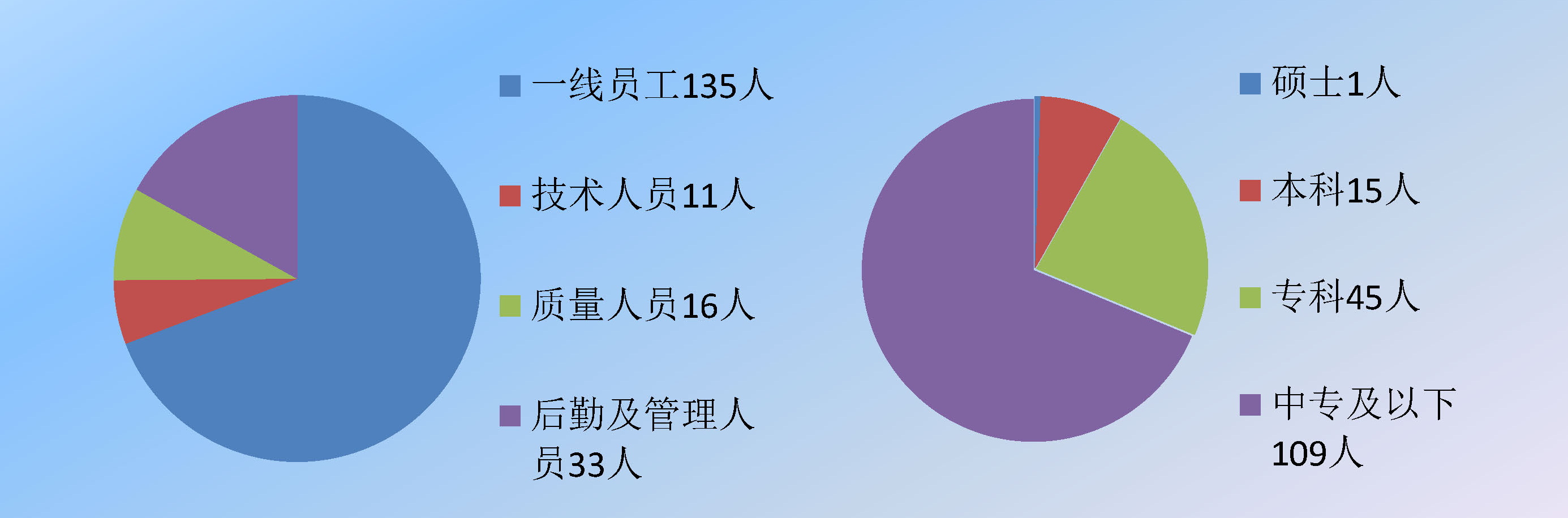 公司从成立之日起陆续从多种渠道揽集专业技术人才、与高校进行技术合作和人才交流、并加强在职人员培养,逐步锻炼出一支优秀的设计研发、生产制造、市场经营管理团队。目前公司总人数195人,其中技术、质量人员27人,具体如下: