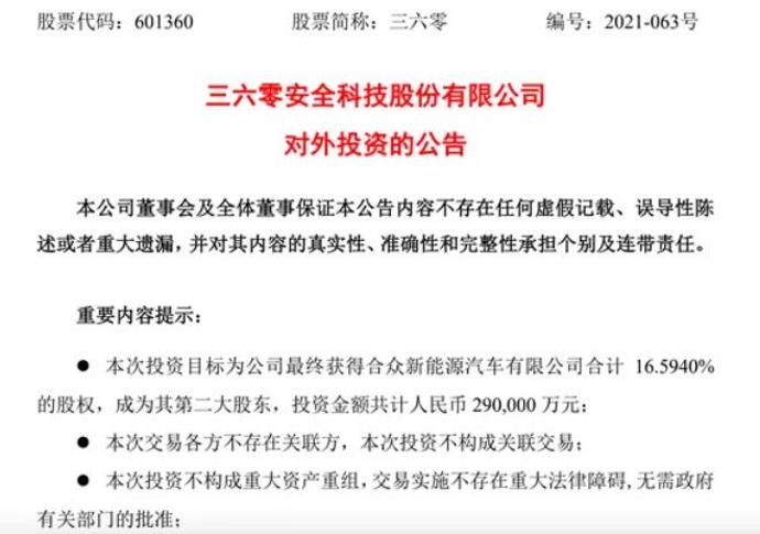 10月18日晚间,三六零安全科技股份有限公司(601360)公告称,拟以自有资金共计人民币29亿元投资入股合众新能源汽车有限公司。