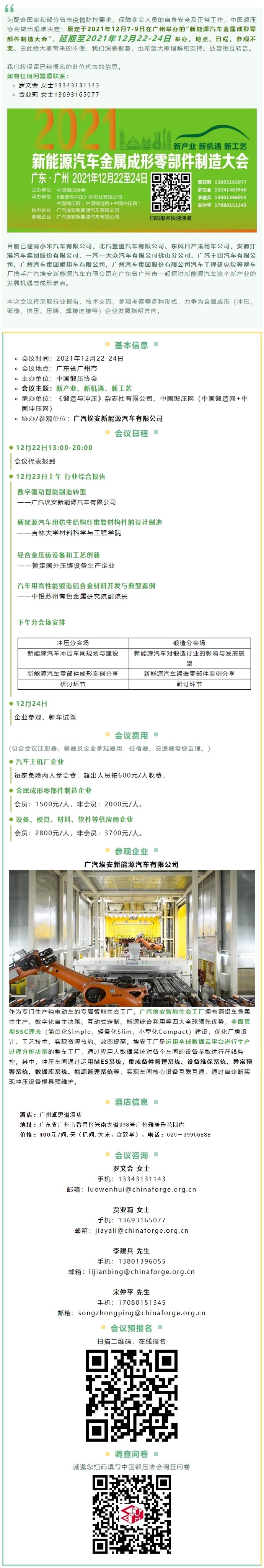 “新能源汽车金属成形零部件制造大会”,延期至2021年12月22-24日 举办,地点、日程、参观不变。