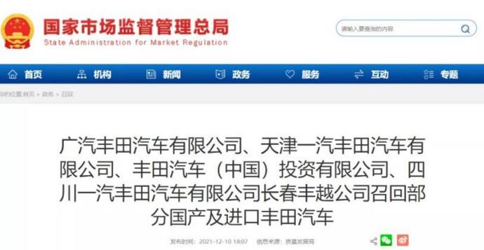 日前,广汽丰田汽车有限公司、天津一汽丰田汽车有限公司、丰田汽车(中国)投资有限公司、四川一汽丰田汽车有限公司长春丰越公司(受四川一汽丰田汽车有限公司授权委托)根据《缺陷汽车产品召回管理条例》和《缺陷汽车产品召回管理条例实施办法》的要求,向国家市场监督管理总局备案了召回计划。