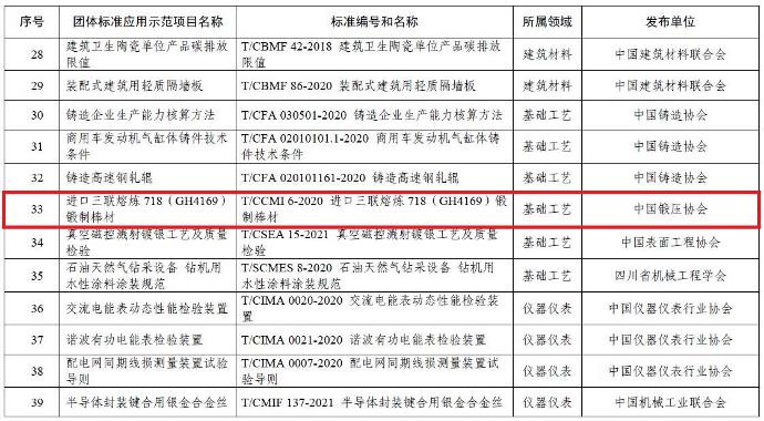 2021年12月30日,工业和信息化部公布111项2021年团体标准应用示范项目, 发布的T/CCMI 6-2020《进口三联熔炼718(GH4169)锻制棒材》团体标准成功入选。
