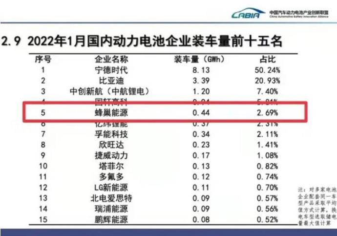 据中国汽车动力电池产业创新联盟发布的最新数据显示,2022年1月份国内动力电池企业装机量排行榜上,蜂巢能源已经跃居行业第五位。