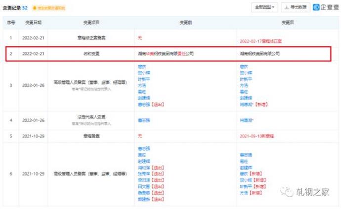 2022年2月21日,华菱钢铁集团有限公司工商登记名称变更,更名为湖南钢铁集团有限公司。湖南钢铁集团有限公司股东为华菱控股集团有限公司(90.21%),湖南发展资产管理集团有限公司(9.79%)。