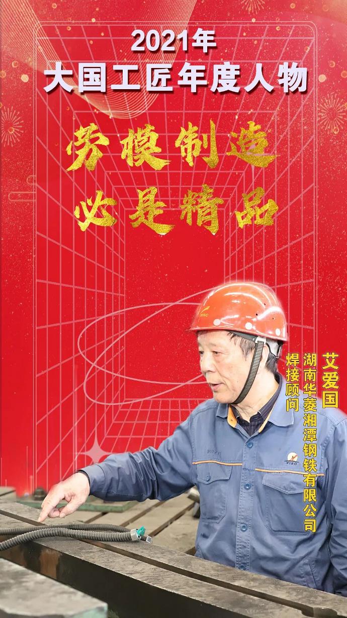 艾爱国19岁进湘钢当工人,从学徒干起,在焊接岗位上工作了半个多世纪。几十年间,他刻苦钻研,成为我国焊接领域的领军人。2021年6月29日,全国劳动模范、全国十大杰出工人、湖南华菱湘钢焊接顾问艾爱国获颁“七一勋章”。