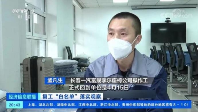 长春一汽富晟李尔座椅公司总经理 李兆国:我们把研发中心的办公室全部征用了,目前我们的员工都住在研发中心的办公室,最大的困难就是我们目前住宿已经达到饱和了,如果再有员工回来,我们就没有办法安排符合防疫规定的住宿条件了。我们现在还做不到“点对点”通勤,现在只返回50%的员工,剩下50%的员工还没办法返回。