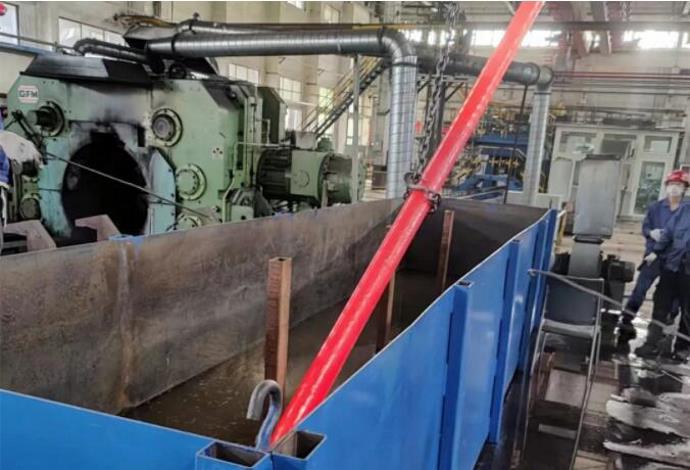 生产过程中,技术攻关小组围绕降低超长工件热弯曲、高温淬火开展攻关。经过与客户的咨询沟通,获取到“201不锈钢材料”的准确参数,通过在锻造生产现场自行设计淬火槽,对超长锻件及时进行淬火作业,保证了淬火速度;通过加固红料槽锻件加工保护,提高锻造速度、解决了超长工件热弯曲的难题,实现了新产品顺利产出。