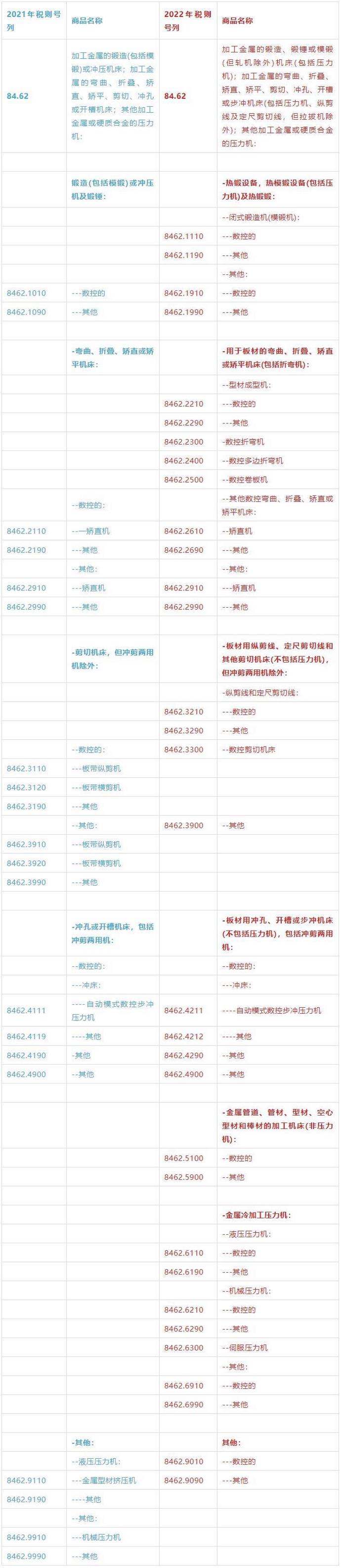 在已发布的2022年版税则中,金属成形机床、增材制造设备相关税则号有较大变化。现将机床工具行业相关商品税则的变化情况编辑整理如下,供行业企业参考。
