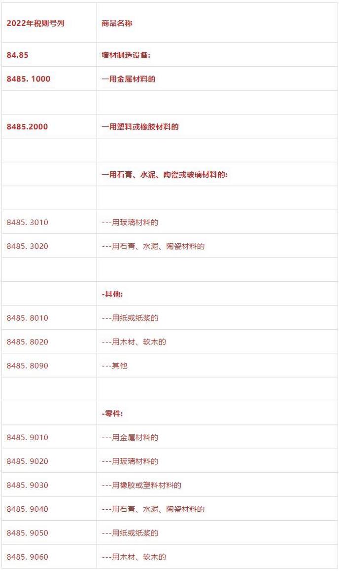 删除了原列在8477品目下橡塑加工机器中的“三维打印机”,新增“增材制造设备”品目8485,并根据设备所使用的材料以及所加工零件的材料设定了子目。