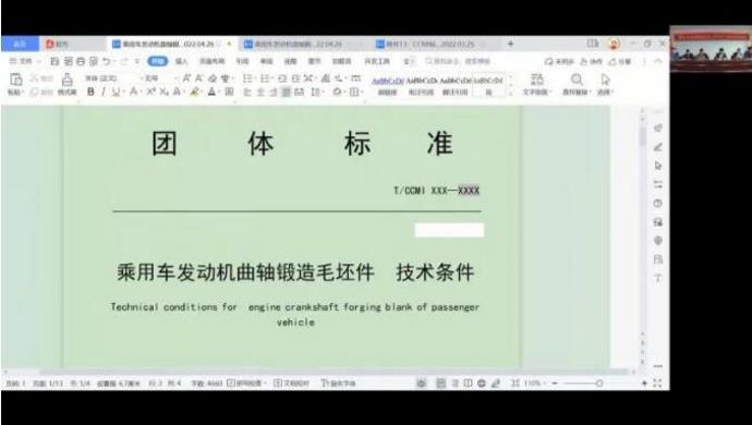 2022年5月20日,由 组织的《乘用车发动机曲轴锻造毛坯件技术条件》团体标准专家评审会视频会议顺利召开。