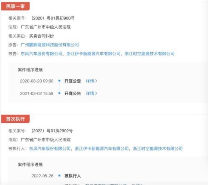 公开信息显示,2022年5月26日,东风汽车股份有限公司、浙江伊卡新能源汽车有限公司和浙江时空能源技术有限公司被广州市中级人民法院强制执行23044794元,案号为(2022)粤01执2902号。