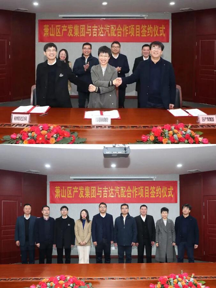 楼塔镇党委副书记、镇长郑红,工投集团总经理陆锡锋,杭州吉达公司总经理楼洋签署三方合作协议,萧山产发集团党委书记、董事长吴水忠,楼塔镇党委书记王晓川,萧山产发集团党委副书记、总经理蒋海芸,杭州吉达公司董事长楼柏生见证。