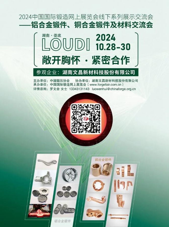 拟定于2024年10月28~30日在湖南省娄底市召开“2024 线下系列展示交流会——铝合金、铜合金锻件及材料”。