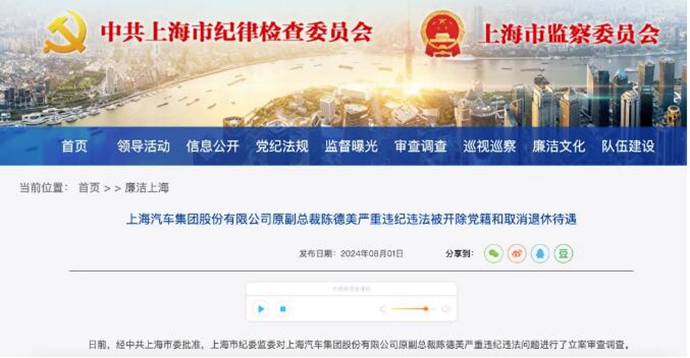 上海市纪委监委网站8月1日通报,上海汽车集团股份有限公司原副总裁陈德美严重违纪违法被开除党籍和取消退休待遇。