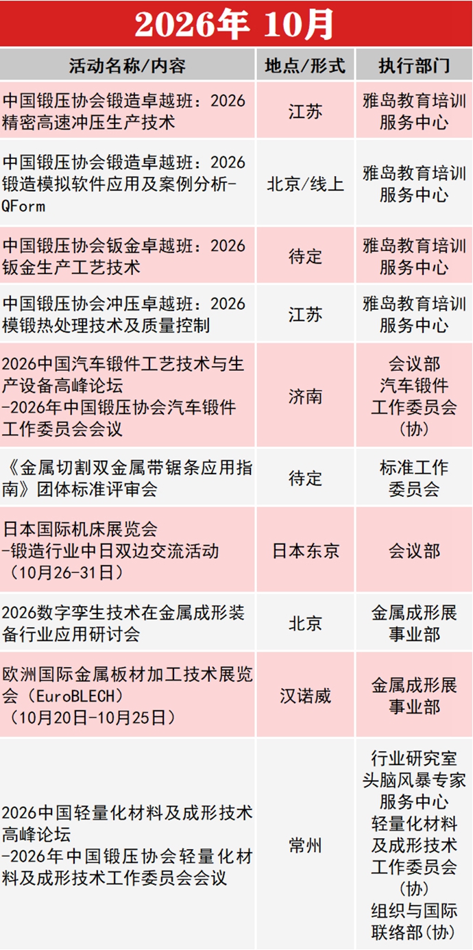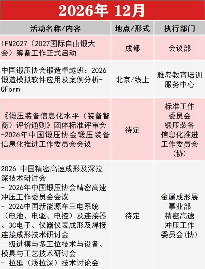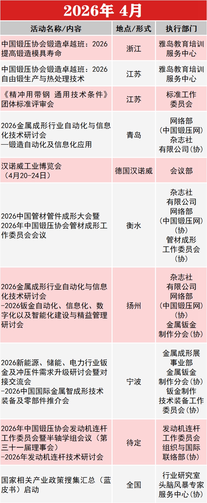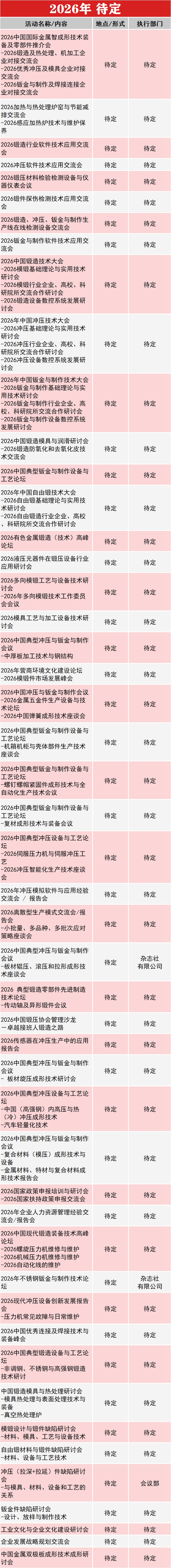 活动计划将根据行业工作需要进行时间、地点和内容的调整,也会有新的活动出台,请关注 官网www.chinaforge.org.cn 和 会议中心www.sinoforging.com信息。