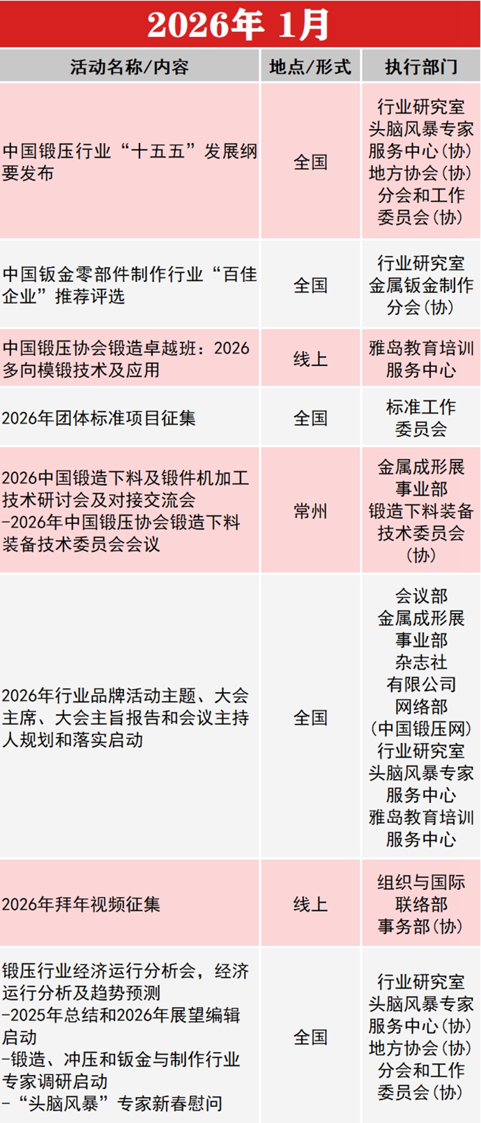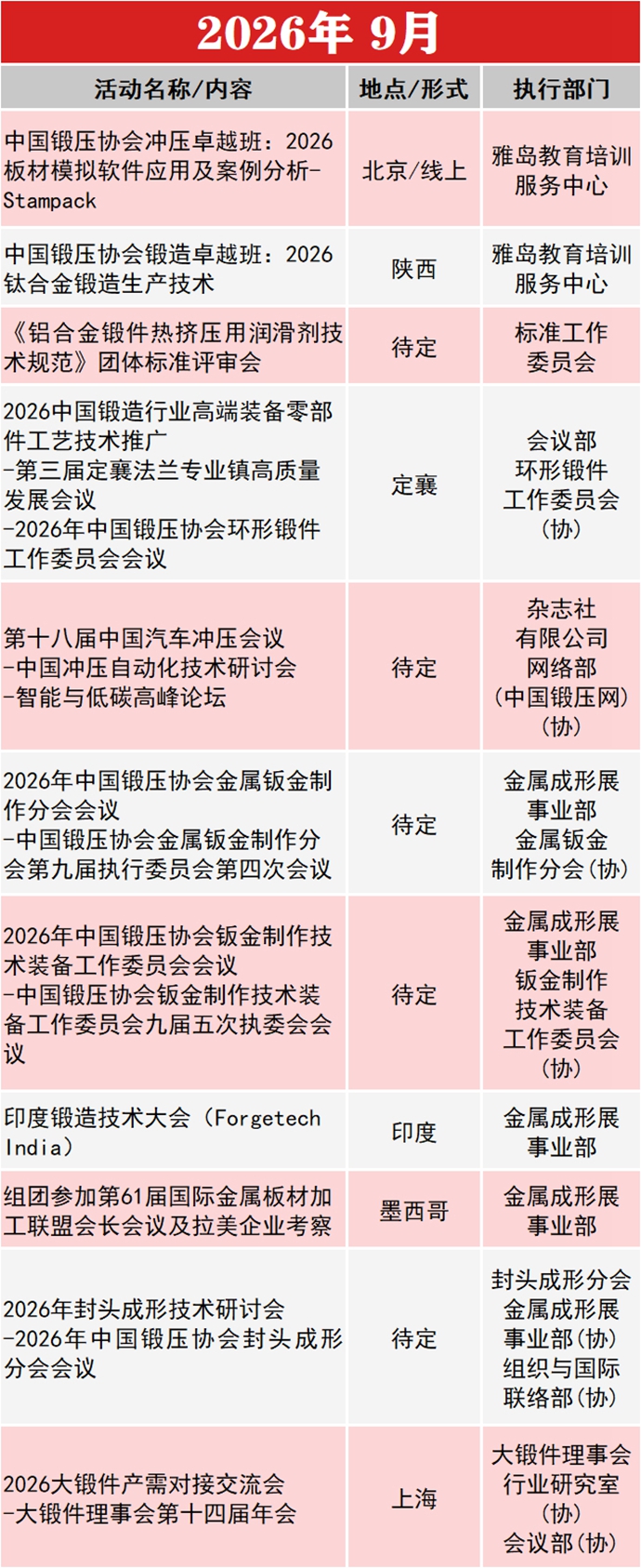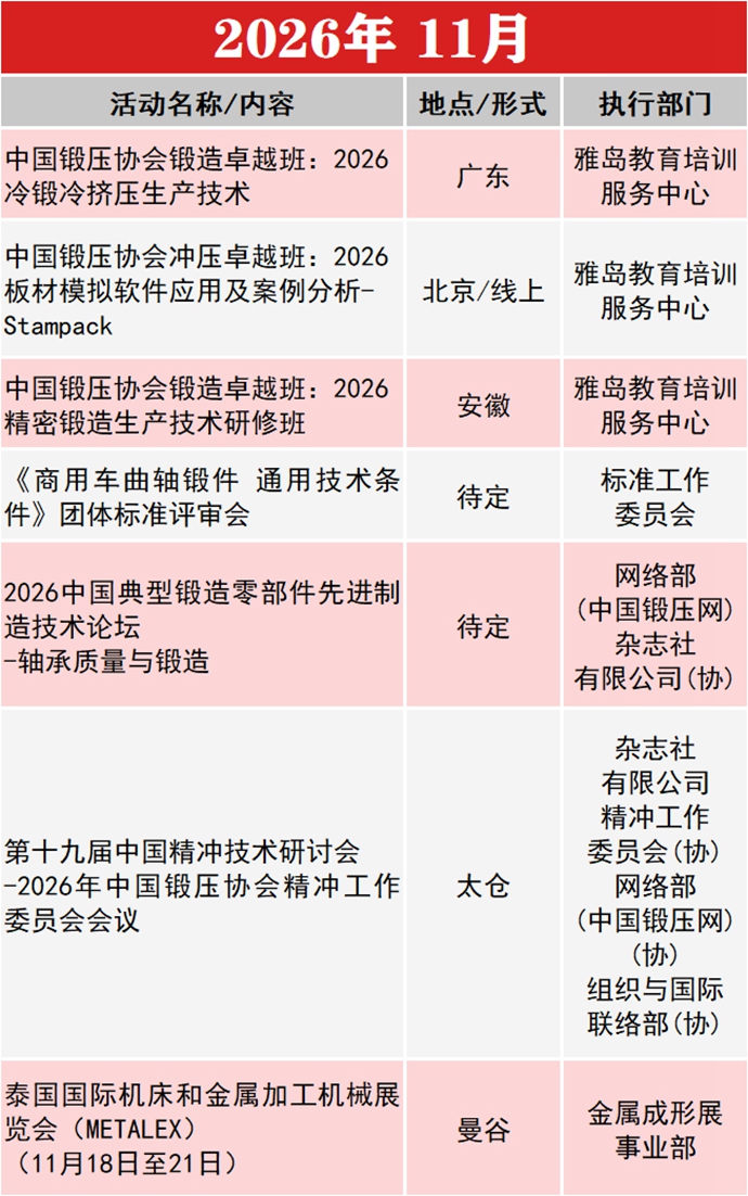 活动计划将根据行业工作需要进行时间、地点和内容的调整,也会有新的活动出台,请关注 官网www.chinaforge.org.cn 和 会议中心www.sinoforging.com信息。