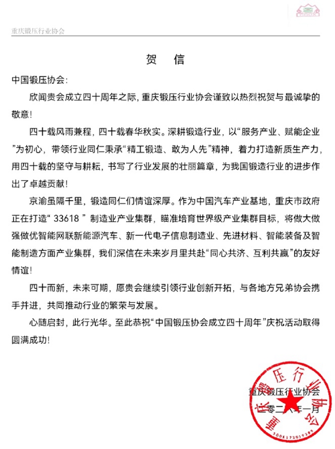 京渝千里,情谊深厚——重庆锻压行业协会向 发来成立40周年贺信