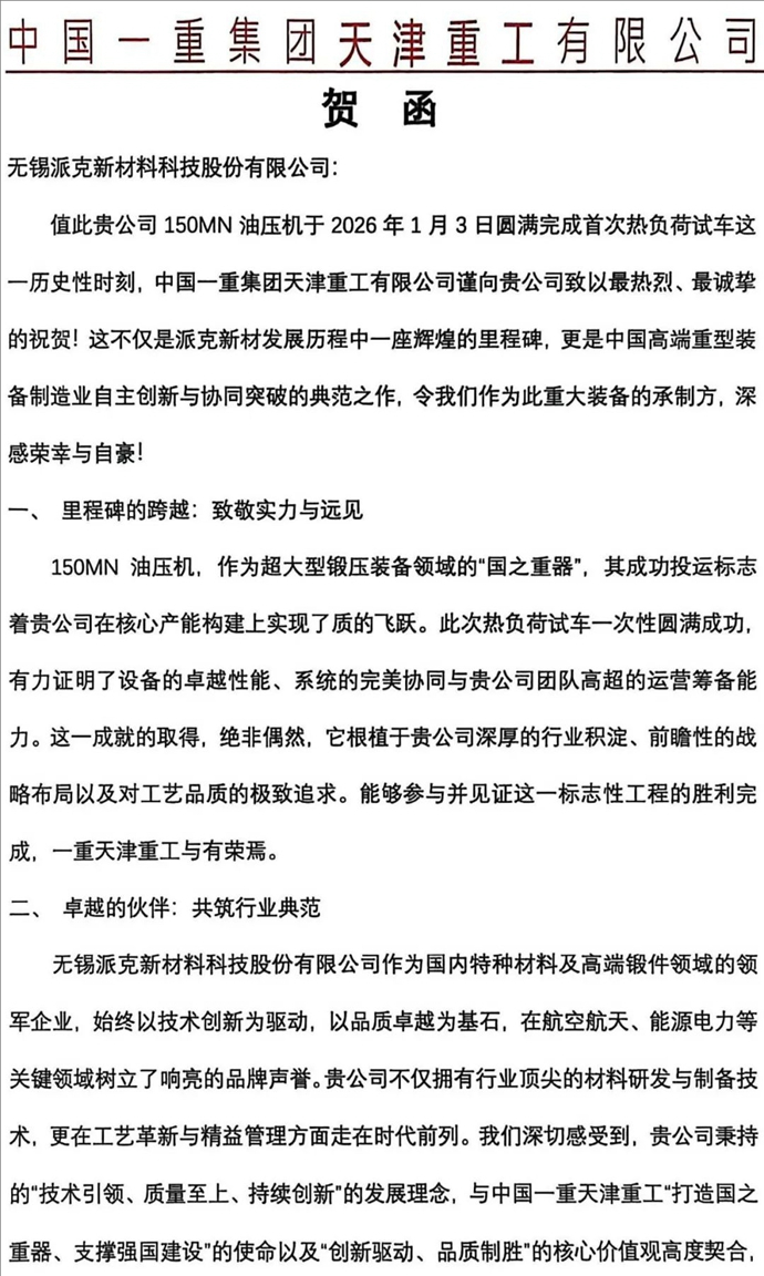由中国一重为无锡派鑫航空科技有限公司量身打造的超大型关键装备——150MN(1.5万吨)油压机圆满完成首次热负荷试车