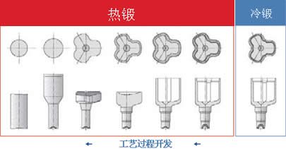 工艺开发 零件设计和工艺方案开发的目的是要确保能够实现工件的经济生产,必须要考虑具体的应用和生产情况。举例来说,如果要生产工件的数量很小,则目标是采用锻造工位较少的工艺,并规划相应的二次机加工工序。高效的零件设计和工艺方案依赖于技术诀窍和实践经验。在工艺方案的开发过程中作出决定,确定使用哪种锻造工艺或哪些锻造工艺组合,例如:正挤压,反挤压,缩径,镦粗,等等。