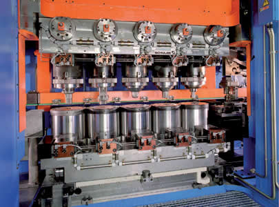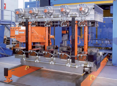 模具冷却和润滑 在温锻和热锻压力机中,需要配备有效的冷却和润滑系统。图示的方案可以提供最佳的润滑布局。此外,还可以对冷却和润滑的持续时间以进行优化。与其他系统相比,例如线性机械手、可旋转系统或安装在传送轨道上的系统,这种布置方式有明显的优势。