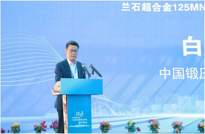 投产仪式上,白玉冰代表 对兰石集团125MN快锻液压机组正式投产表示祝贺。他指出,机组的投产,将进一步提升我国高端锻件的自主制造能力,促进关键领域国产化替代,提升我国高端装备制造领域整体竞争力。 将一如既往发挥桥梁和平台作用,与行业同仁携手并进,共同谱写中国锻造的新篇章。