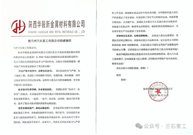 感谢信中,陕西华锻高度评价了双方在80MN快锻机组项目中的合作成果。信中提到,兰石重工项目团队以坚定的责任担当、扎实的技术功底、创新的解决方案和精准的需求响应,确保了项目高质量交付。特别是项目调试阶段,技术服务小组无私奉献、挂图作战、攻坚克难,最终实现机组提前投产,性能参数全面达标,显著提升了陕西华锻在钛产业链锻造方面的市场竞争力,为其高质量发展注入了强劲动能。