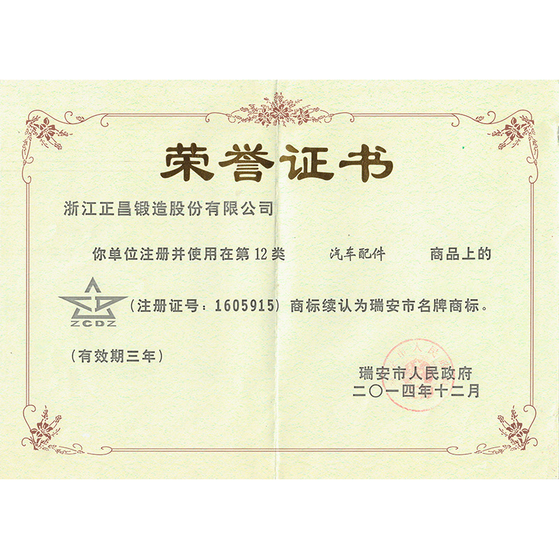 瑞安市名牌商标证书