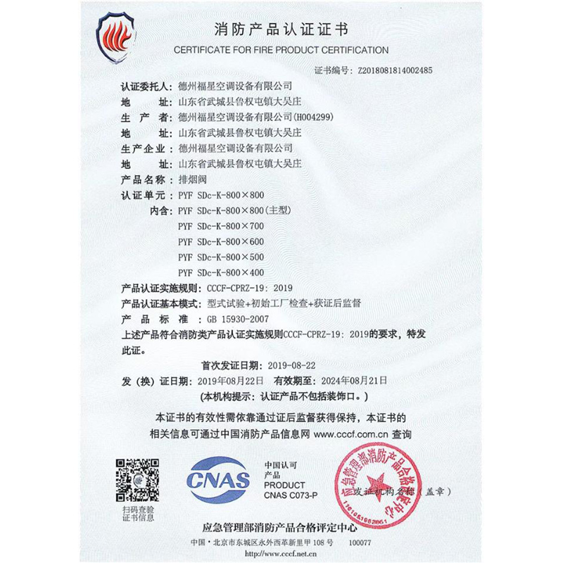 排烟阀-消防产品认证证书