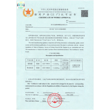 船用产品(工厂)认可证书