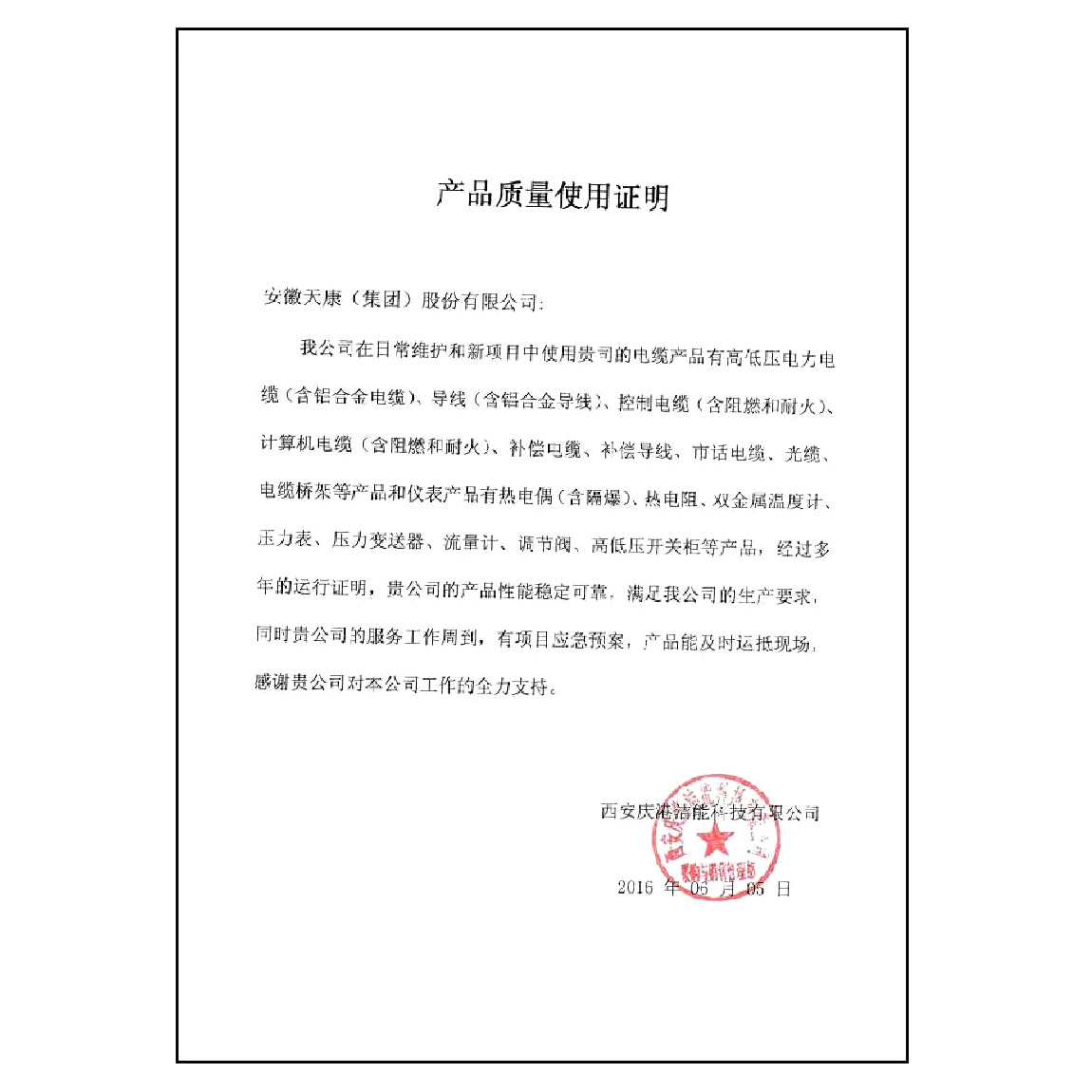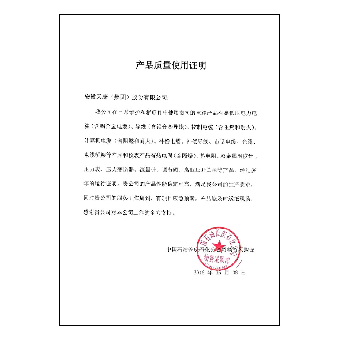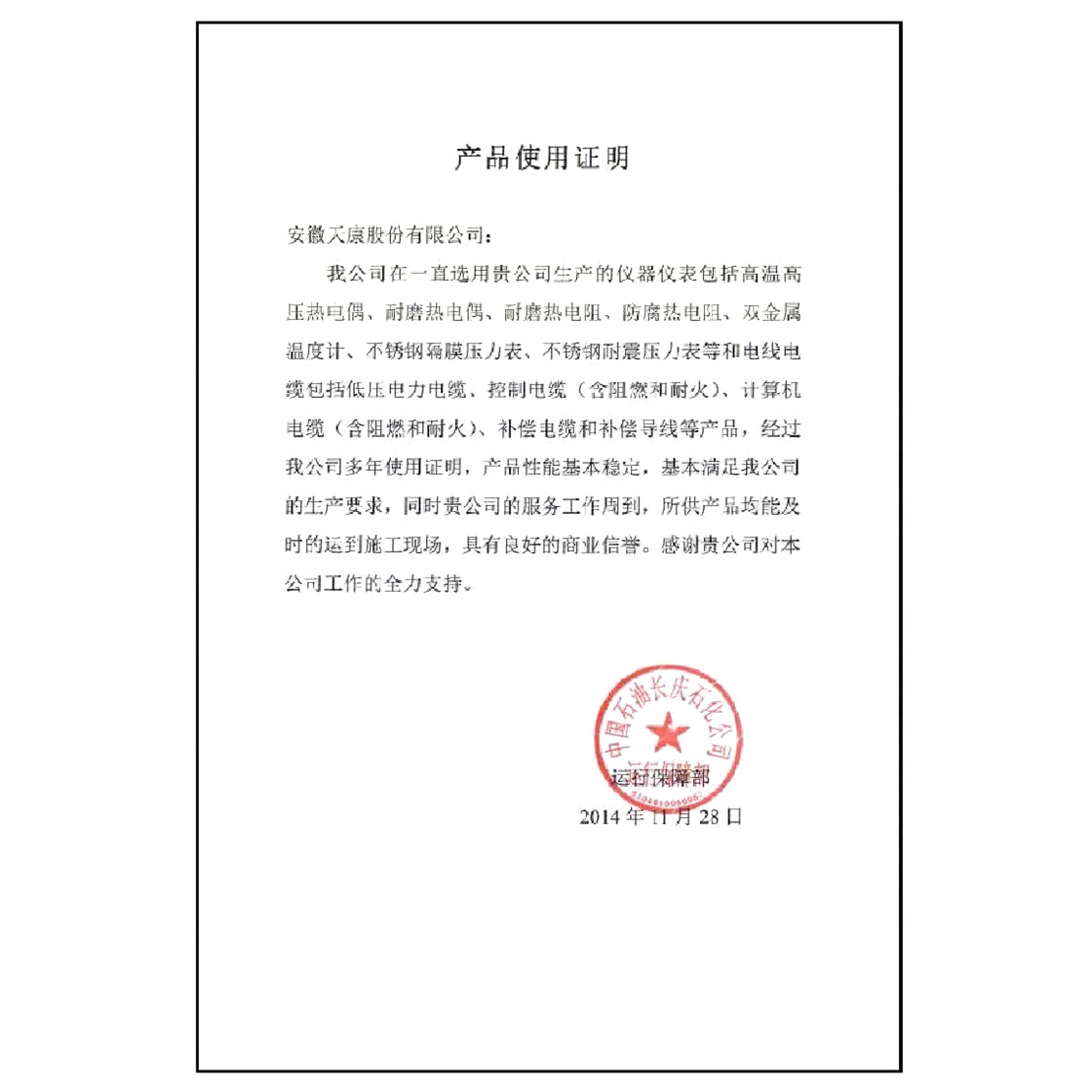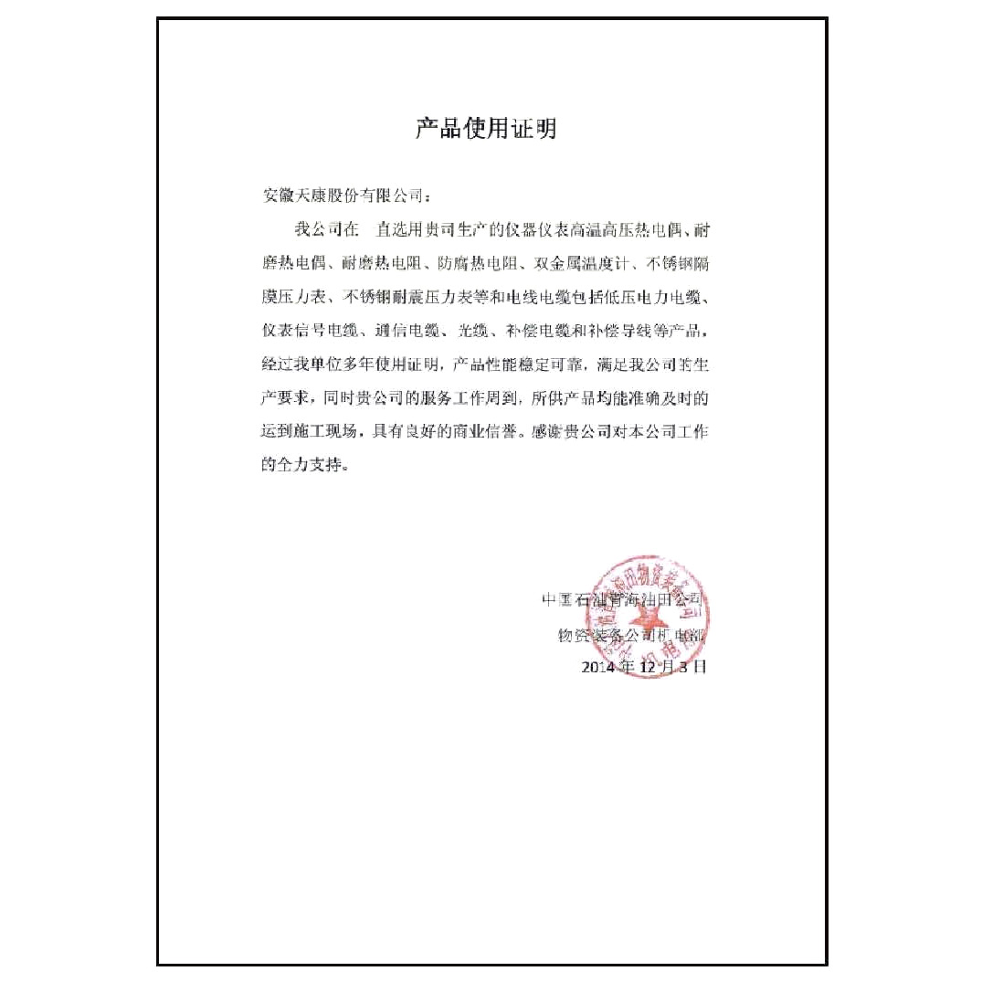 产品适用性证书