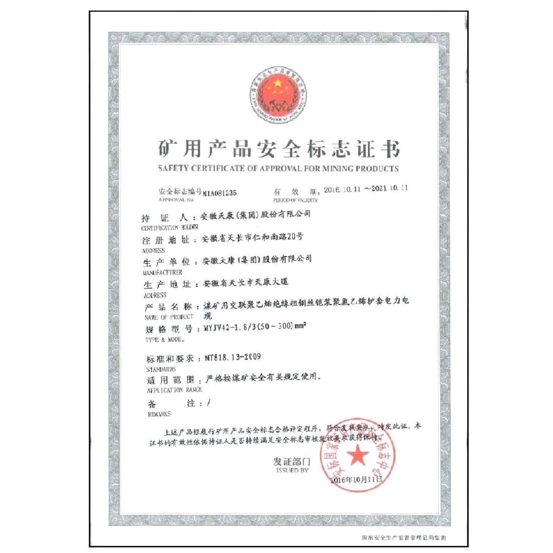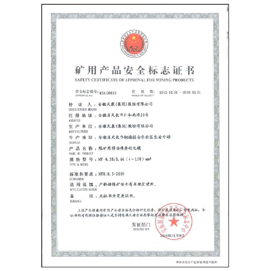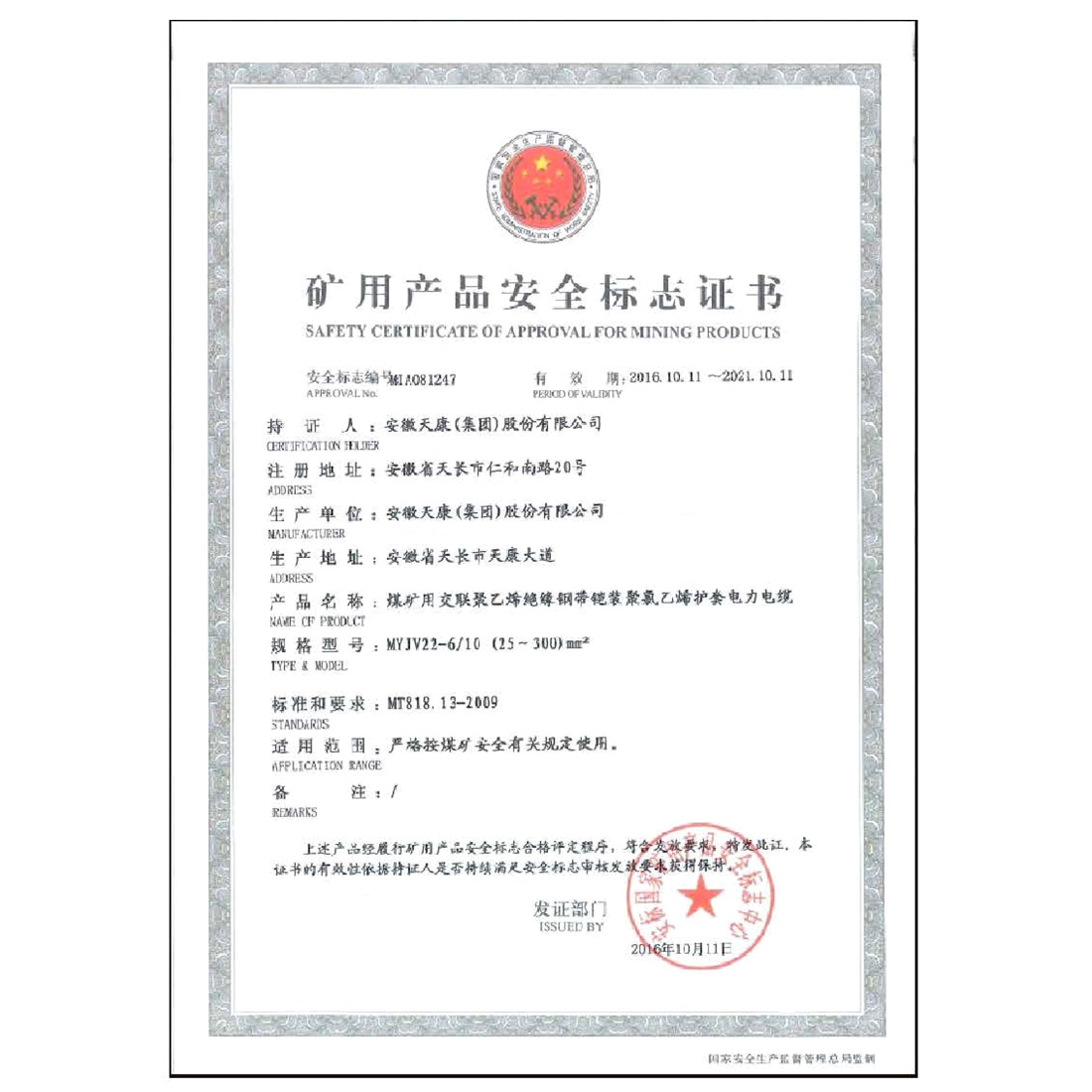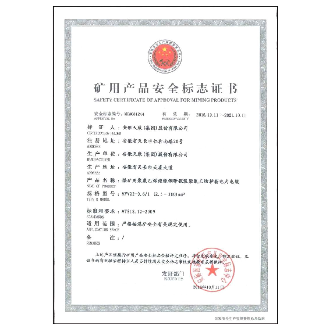 矿用产品安全标志证书