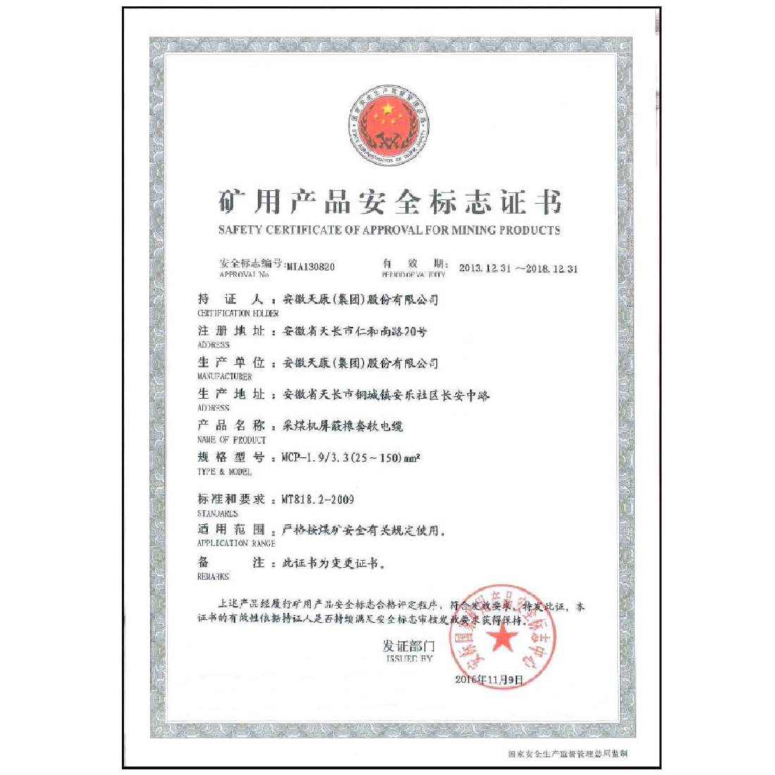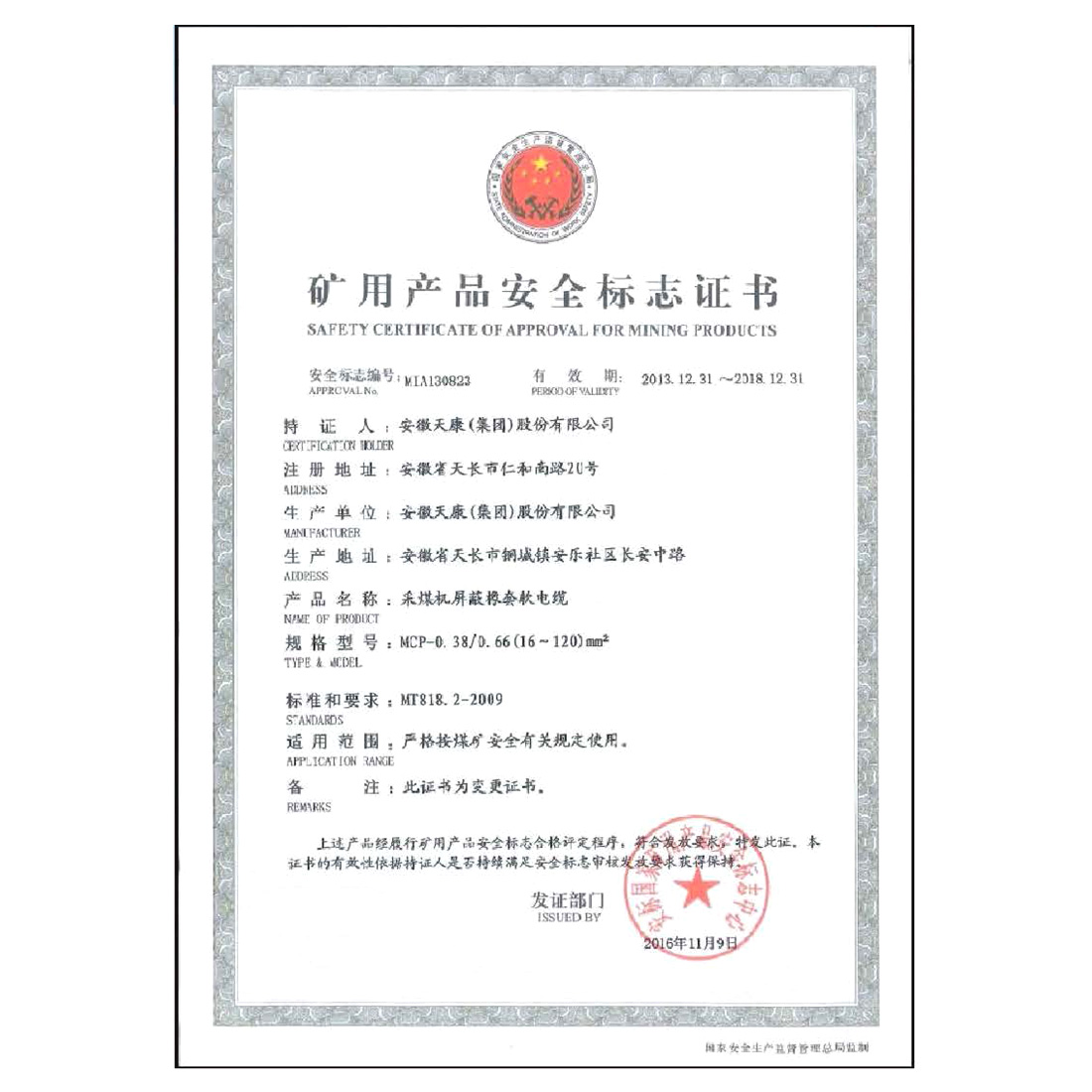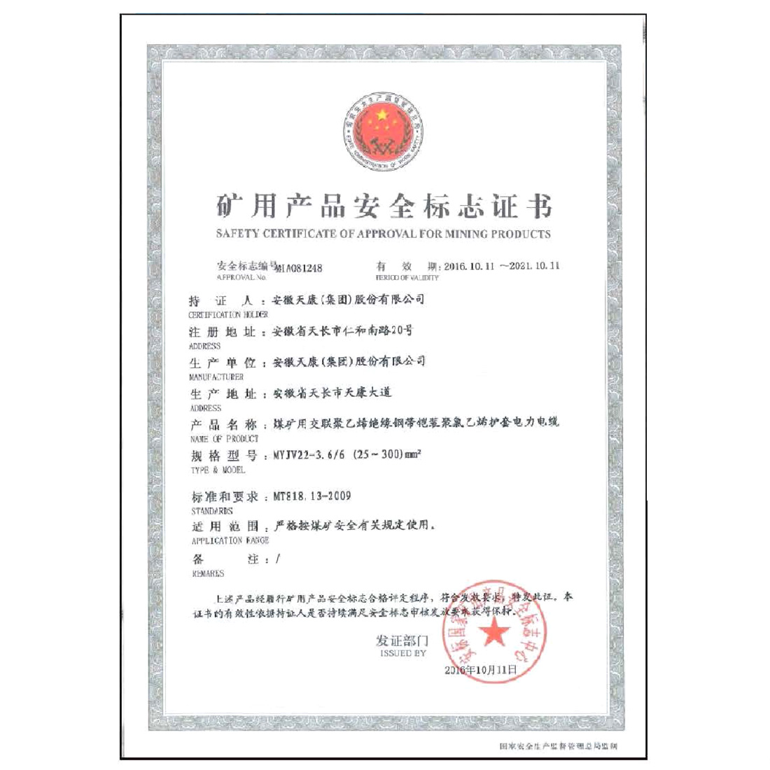 矿用产品安全标志证书