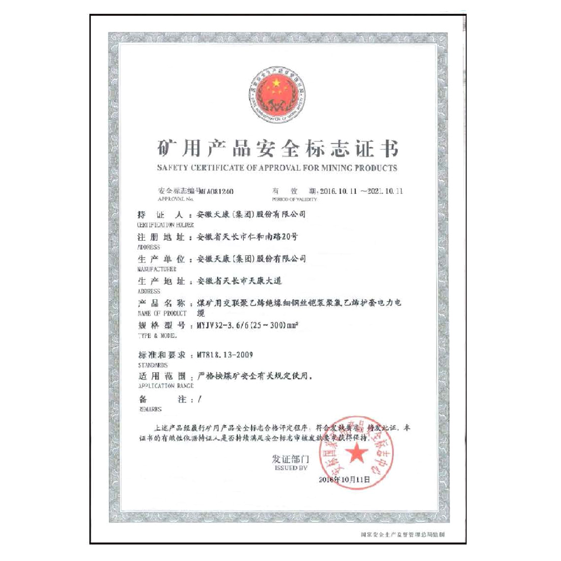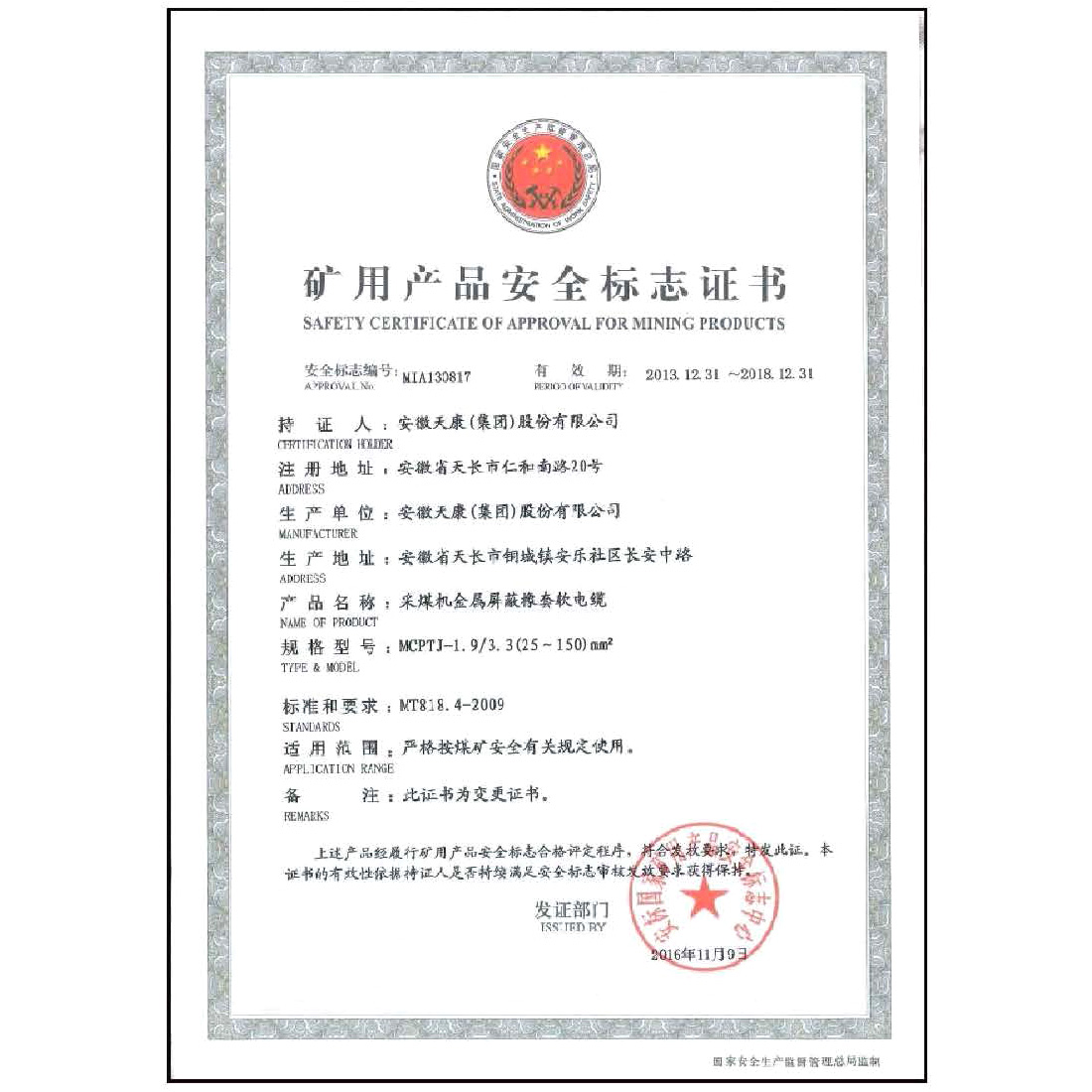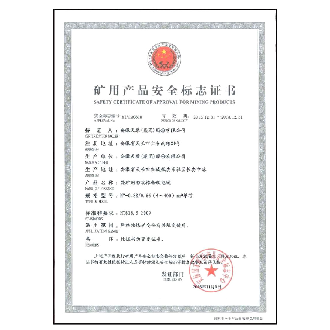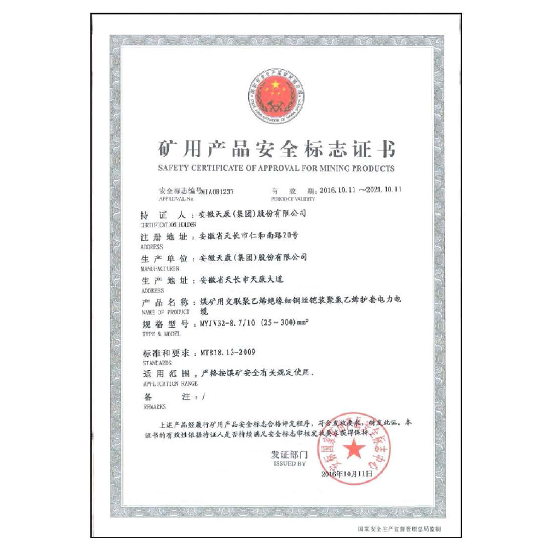 矿用产品安全标志证书