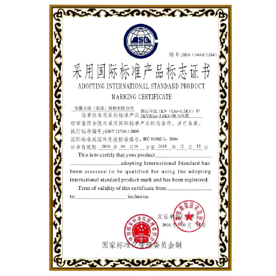 采用国际标准产品标志证书