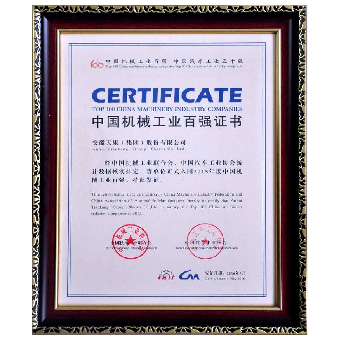 中国机械工业百强证书