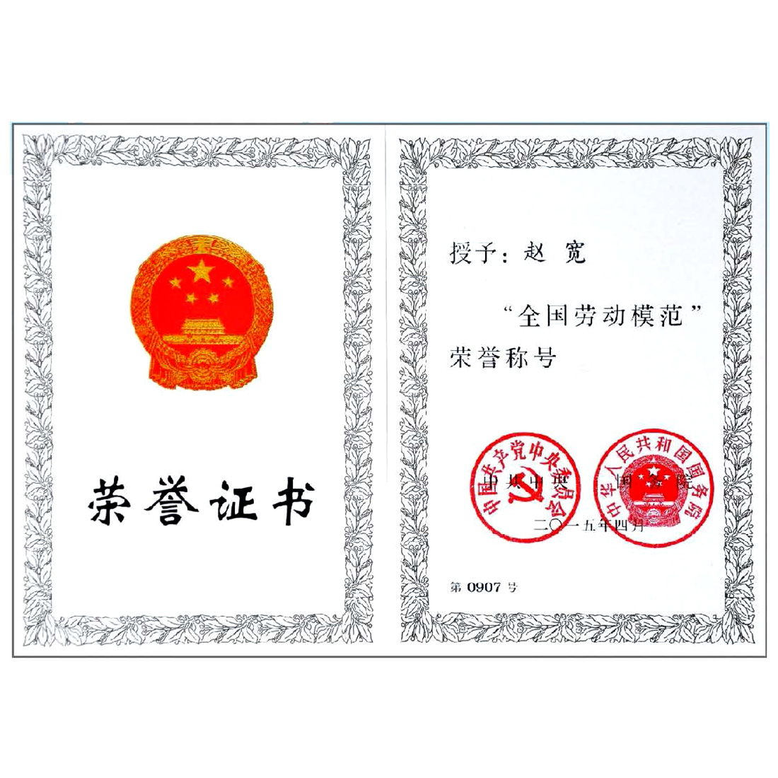 全国劳动模范荣誉证书