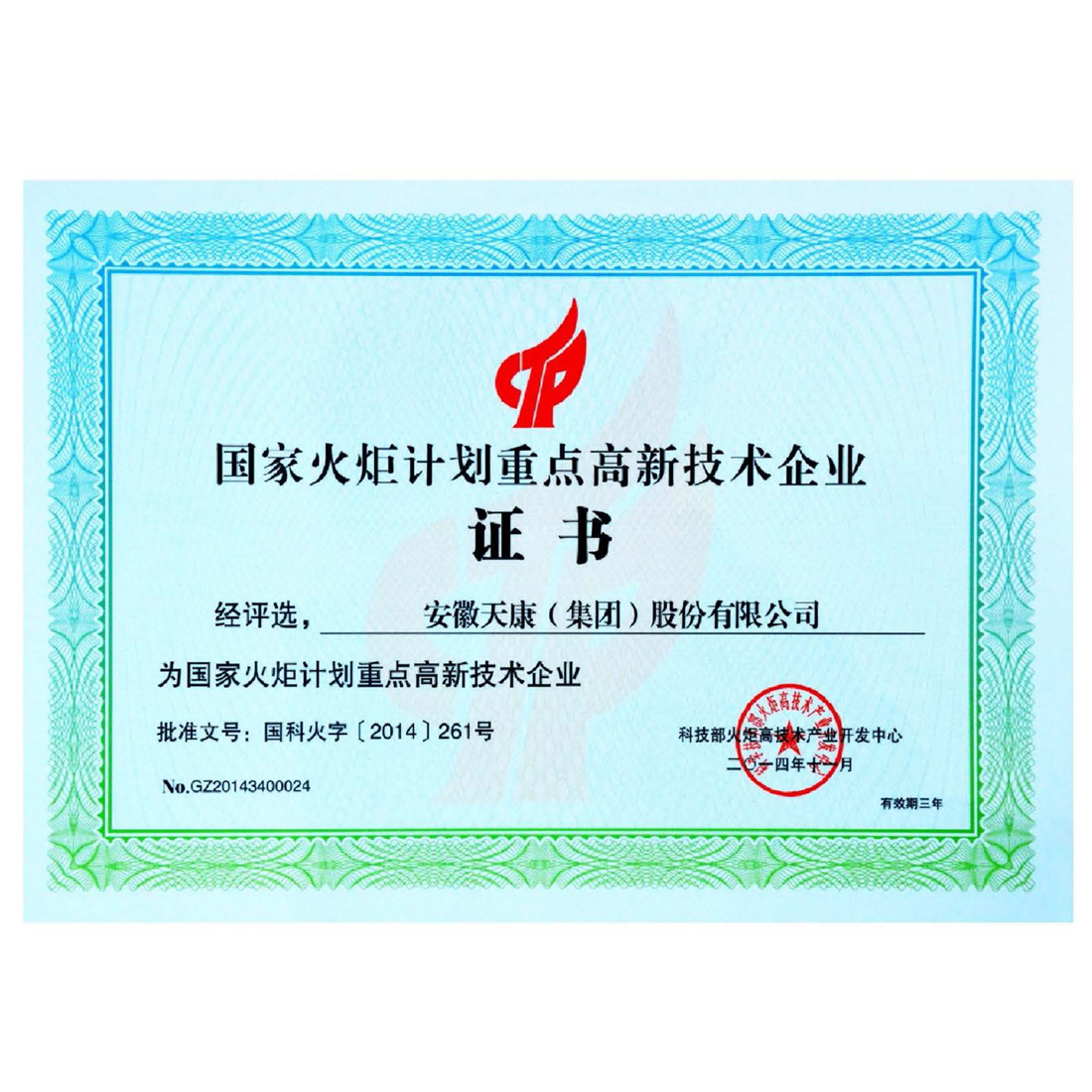国家火炬计划重点高新技术企业证书
