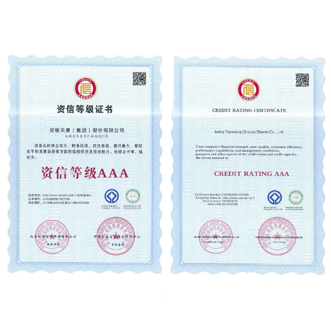 资信等级AAA证书