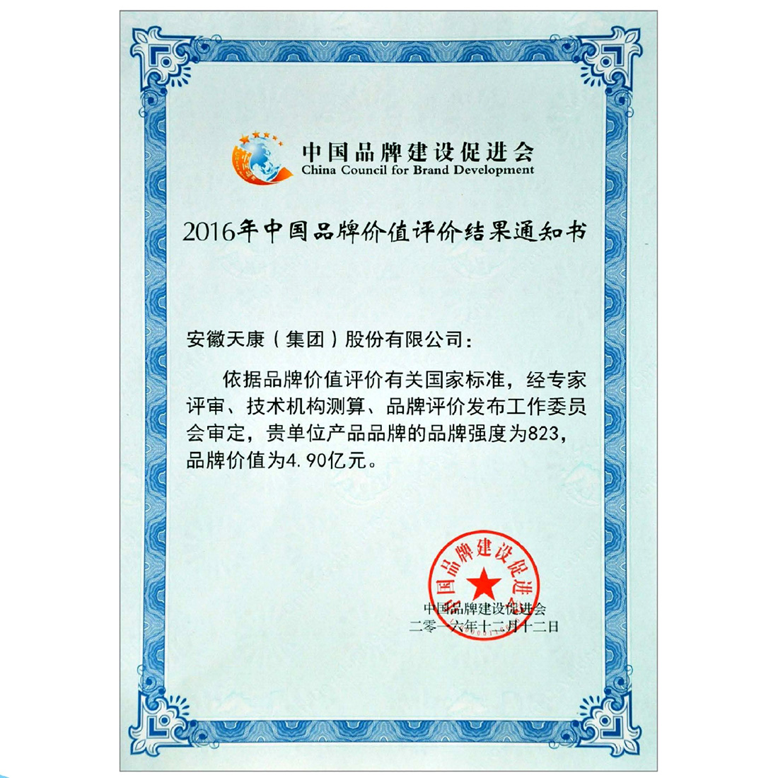 2016年中国品牌价值评价结果通知书