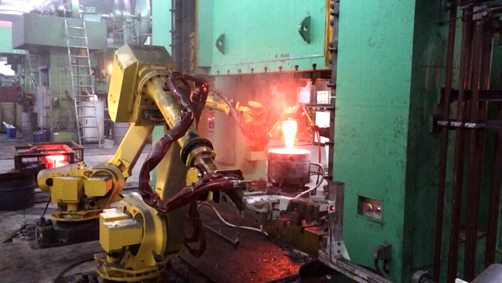 可实现金属锻造自动上下料、喷脱模剂、切边、去毛刺等自动化生产要求,通过多台机器人和多台压机可搭建一组多工位锻造成型流水线,可量身定制机械定位、视觉传感器定位等工件自动上料定位方式,实现批产工件装夹的精确定位,提高锻造质量。通过逻辑控制程序和机器人示教路径优化,确定优化的工艺流程,充分发挥压机加工效率。专利产品“机器人锻压柔性手爪”(发明专利号ZL201510293475.9)解决了锻造过程中瞬间冲击导致的机器人过载问题。