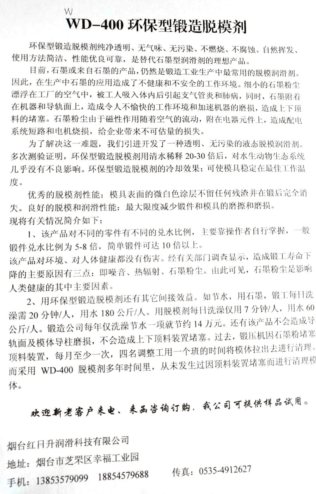 2、用环保锻造脱模剂还有其它间接效益。如节水,用石墨,锻工每日洗澡需20分钟/人,用水180公斤/人。用脱模剂每日洗澡仅用7分钟/人,用水60公斤/人。锻造公司每年仅洗澡节水一项就节约14万元。还有该产品不会造成导轨面及模体导柱磨损,不会造成上下顶料装置堵塞。过去,锻压机因石墨粉堵塞顶料装置,每月至少一次,四名调整工用一个班的时间将模体拉出去进行清理。而采用WD-400脱模剂多年时间里,从未发生过因顶料装置堵塞而进行清理模体。