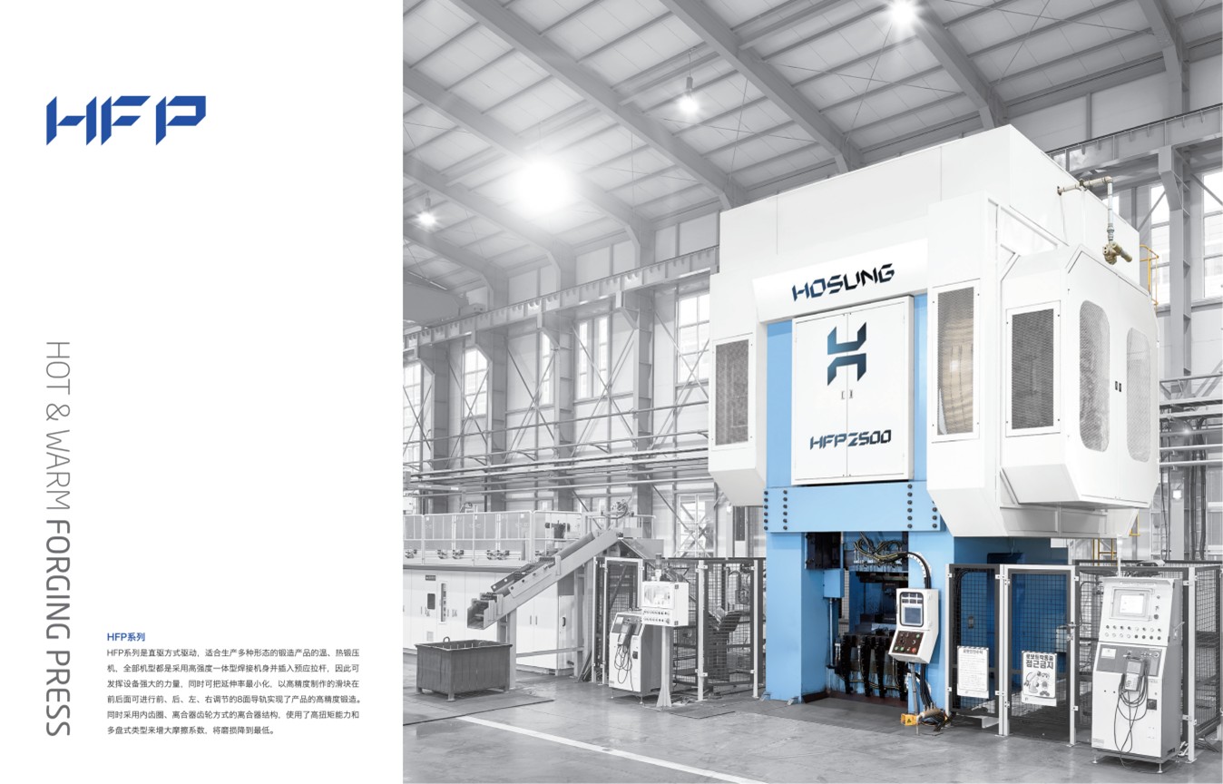 HFP系列是直驱方式驱动,适合生产多种形态的锻造产品的温、热锻压机,全部机型都是采用高强度一体型焊接机身并插入预应拉杆,因此可 发挥设备强大的力量,同时可把延伸率减小,以高精度制作的滑块在 前后面可进行前、后、左、右调节的8面导轨实现了产品的高精度锻造。