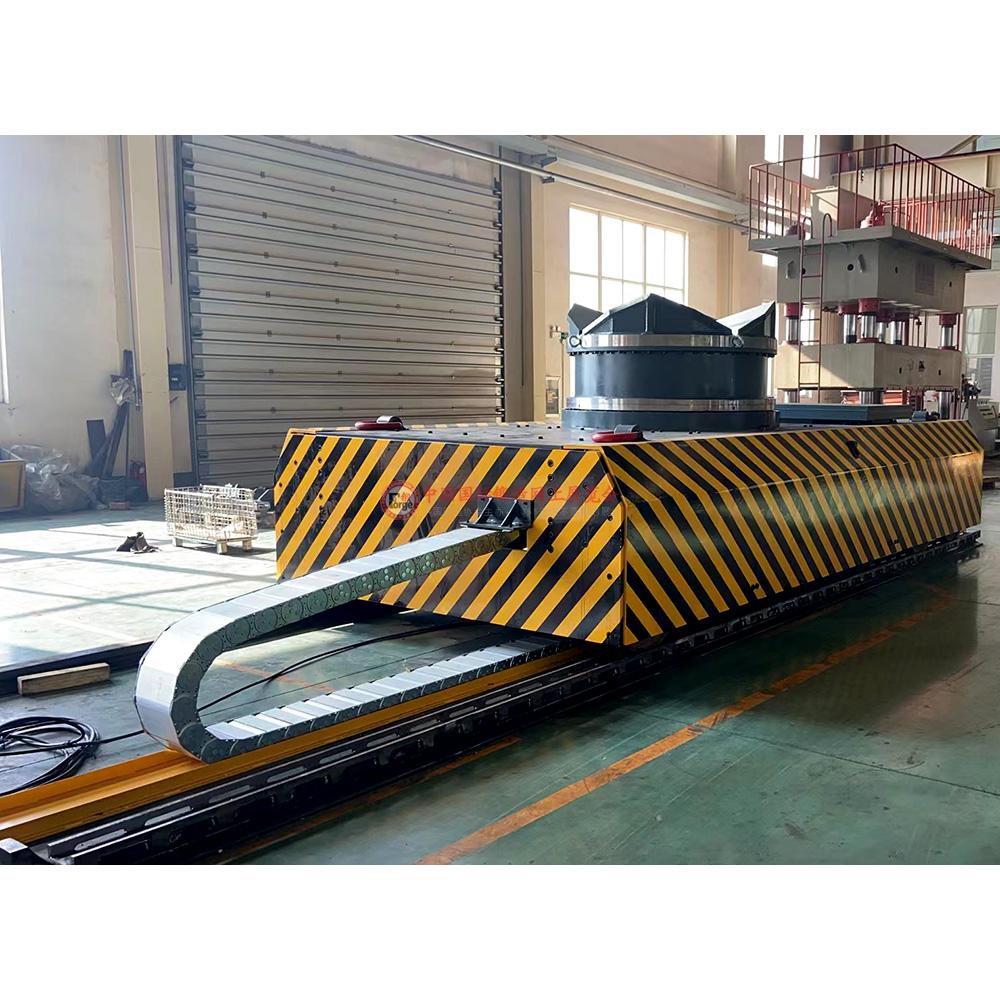 运锭小车主要包括车体和驱动运锭小车在运锭小车轨道上行走的行走机构,设置于车体底部。此外,运锭小车还配备有用于承载和旋转定位锻造件的旋转机构,该机构设置于车体上。这种设计使得运锭小车能够有效地减少锻压上料时间,提高整个锻压机组设备的工作效率,同时保证定位准确,从而提升锻压质量。